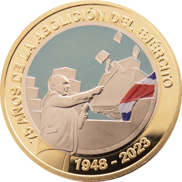 En el reverso de la moneda, la conmemoración de los 75 años de la Abolición del Ejército cobra vida. Basado en la única fotografía conocida del momento histórico, capturada por el fotoperiodista Mario Roa Velázquez, el diseño resalta la impactante imagen de Figueres Ferrer golpeando la almena. La leyenda “75 años de la Abolición del Ejército,” los años “1948 – 2023,” y la frase en micro texto, “El mundo nos conoce y nos respeta por la decisión de levantar cuadernos y violines,” añaden capas de significado a esta obra maestra numismática.